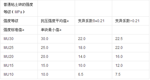 2、強度等級。強度等級根據(jù)10塊磚的抗壓強度平均值、標準值或最小值劃分,共分為MU30、MU25、MU20、MU15、MU10五個等級,在評定強度等級時,若強度變異系數(shù)δ≤0.21時,采用平均值——標準值方法;若強度變異系數(shù)δ>0.21時,則采用平均值——最小值方法。其具體要求如下表所示。